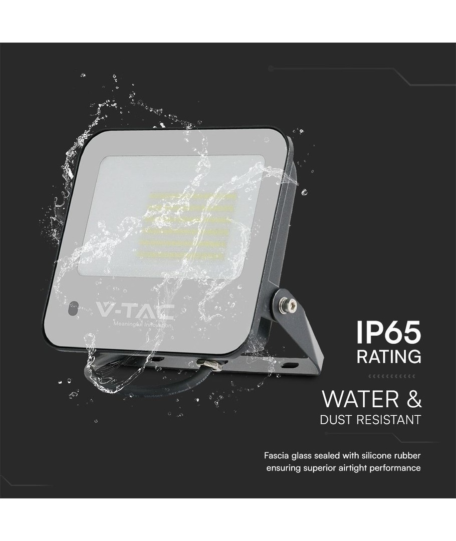 V-Tac LED lyskasteren er designet for å tåle ekstreme værforhold med sin IP65-klassifisering, noe som gjør den motstandsdyktig mot vannsprut og regn. Dens slanke design med dimensjoner på 169 x 183,5 x 34 mm gjør den enkel å montere nesten hvor som helst.