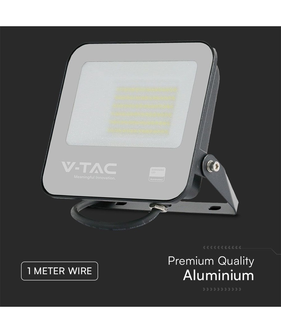 For å tåle de tøffe værforholdene, er lyskasteren utformet med et IP65-klassifisert hus i en elegant svart farge og grå mattet glass. Den tåler både vannsprut og regn, slik at den kan brukes utendørs med letthet.