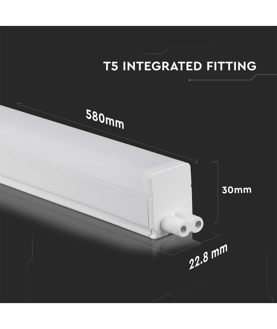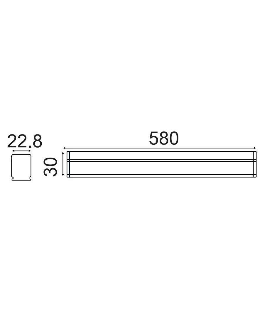 Armaturen har dimensjoner på 580 x 30 x 22.8 mm og er designet for tilkobling til en 230V forsyning. Den er ikke vannbestandig (IP20), og har en integrert lyskilde, noe som forenkler installasjonen.