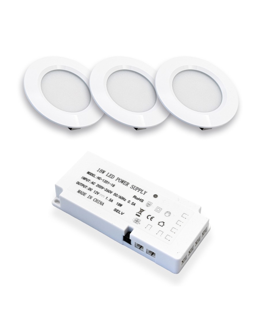 Med dette settet får du 3 stk. Reco68 møbelspots i hvitt, samt 12V DC strømforsyning, med plass til 6 møbelspots.