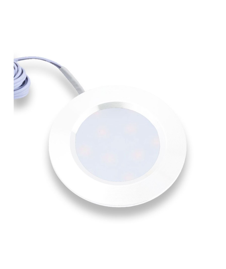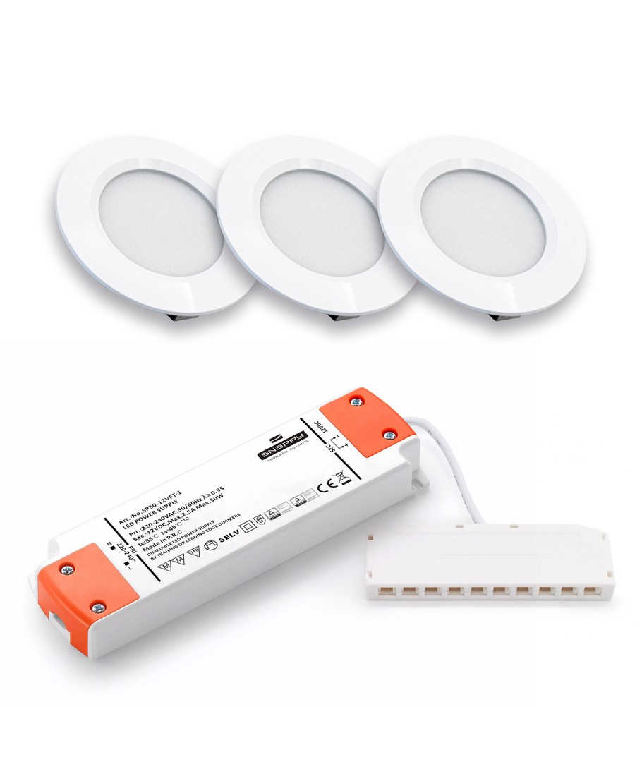 Med dette settet får du 3 stk. Reco68 møbelspots i hvitt, samt dimbar 30W strømforsyning, med plass til 10 møbelspots.