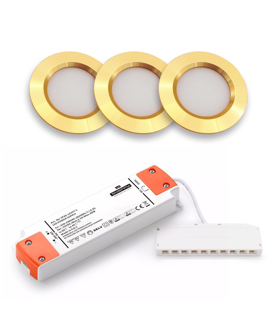 Med dette settet får du 3 stk. Reco68 møbelspots i gullfarge, samt dimbar 30W strømforsyning, med plass til 10 møbelspots.