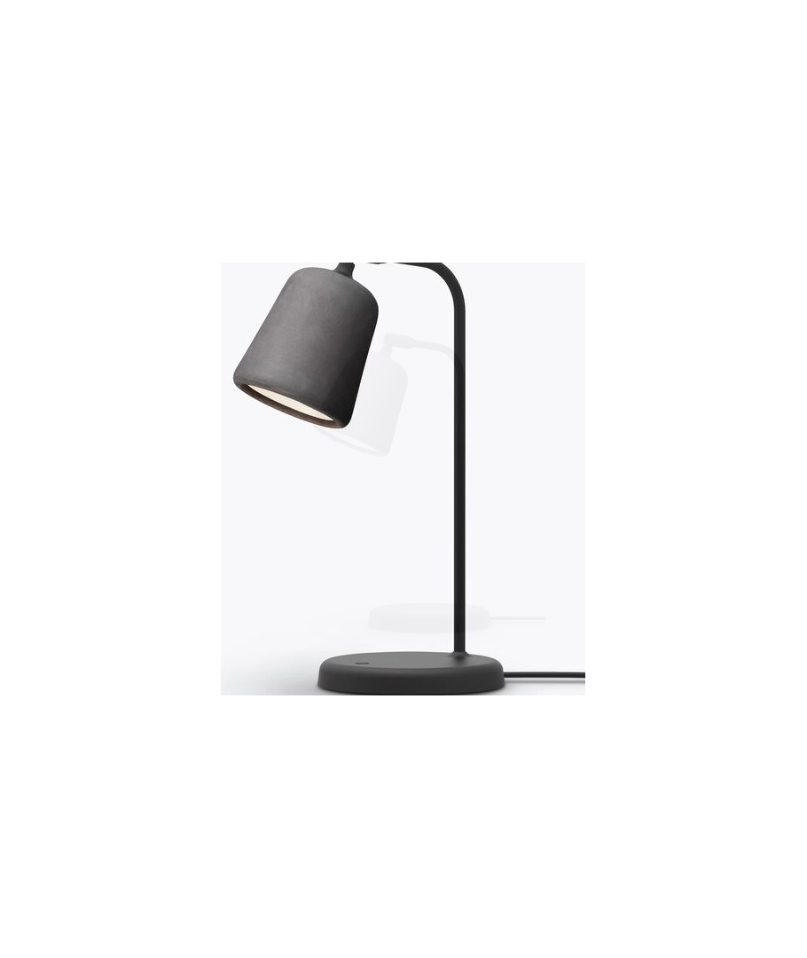 Skjerm og fatning sitter på et kort stativ i sort stål, med et ledd slik at lampen kan justeres.