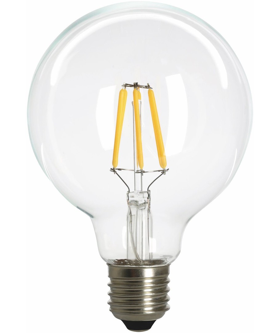 Dekorativ LED globepære (G95) i gylden varm lysfarve på 2100 kelvin.