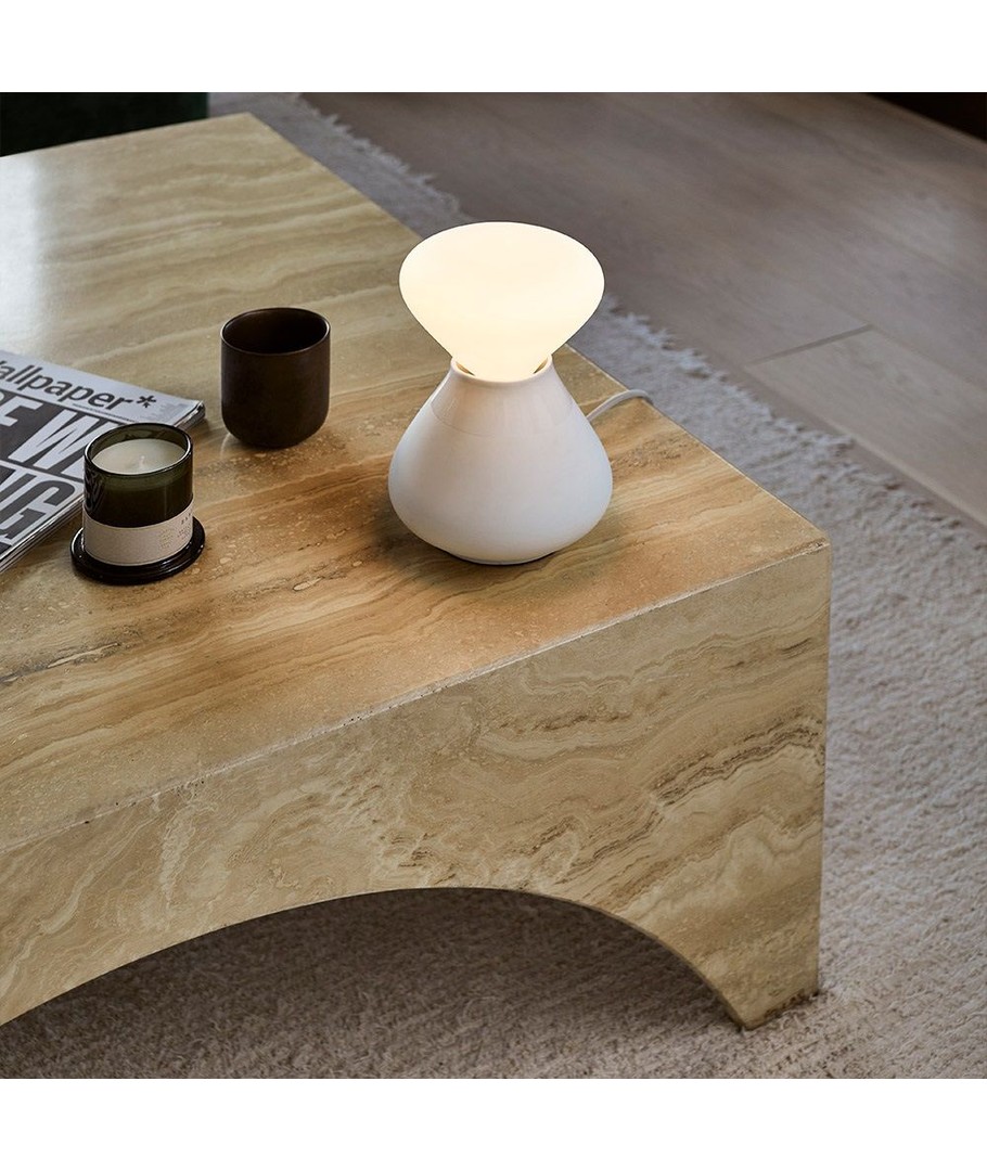 Den avrundede trekantede formen på Noma-pæren gjenspeiles herlig av Premium porselenslampen, mens den høyglansreflekterende glasuren på den øverste tredjedelen av basen fremhever pærens glød for å gi serien sitt navn.