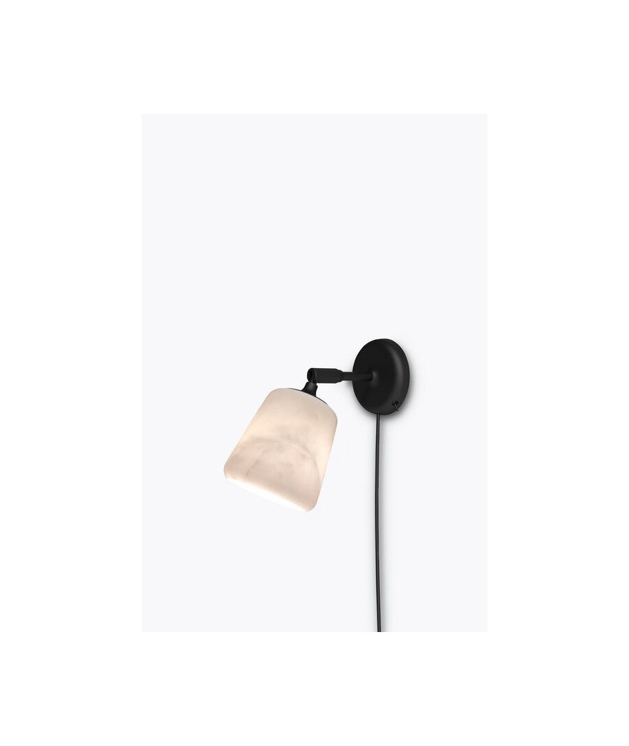 Skærm og fatning sidder på væggen i en kort arm i sort stål, med et kipled så lampen kan justeres.