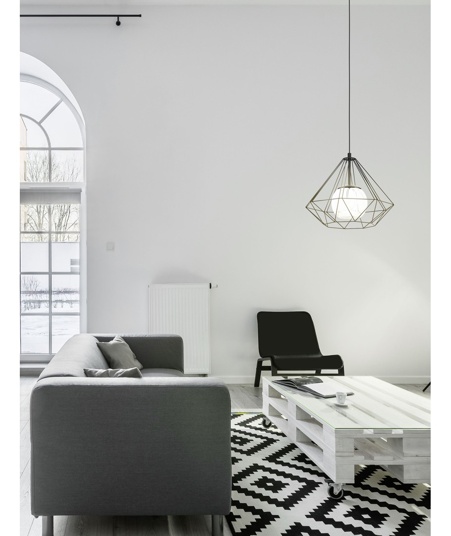 Glaskuplen er igen omgivet af et diamand-formet gitter i sort stål, som giver lampen en spændende form, uden at bryde den elegante stil.