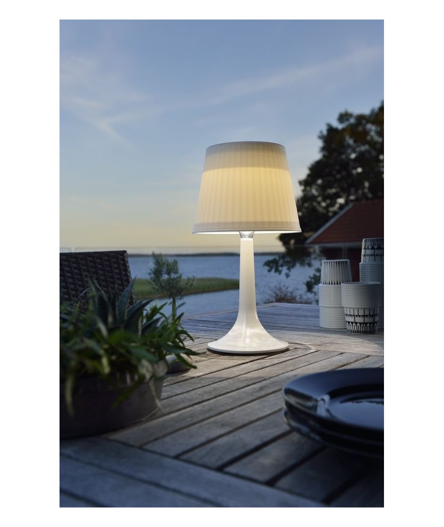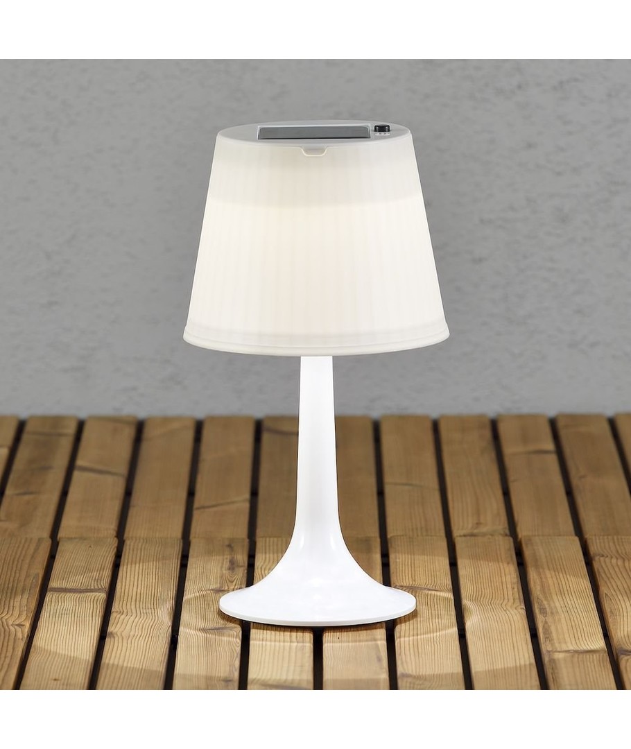 Assisi LED bordlampe har innebygd batteri som lades via solcellene på toppen av lampeskjermen, hvor avbryterknappen også er plassert. Den er utført i hvit plast og har utseende som en tradisjonell innendørs bordlampe med retro-referanser.