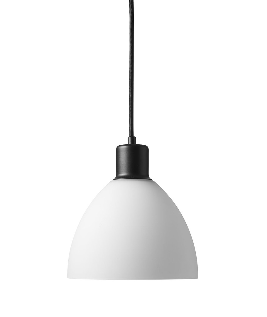 1 pendel i opalglass med mattsorte fatninger opphengt i sort stoffledning.