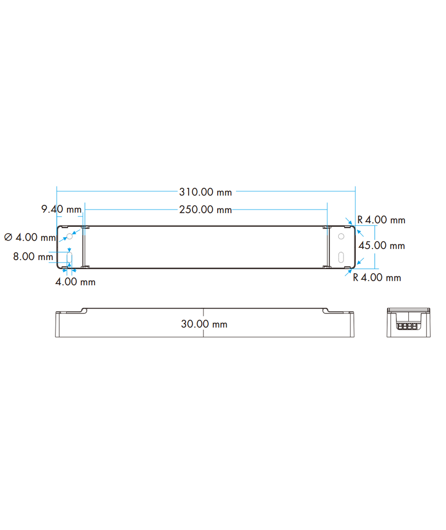 Denne strømforsyningen er designet for å være enkel å montere, med slanke dimensjoner på 310 x 30 x 45 mm, noe som gjør det enkelt å plassere den i mindre rom eller bak skap. Husk at med en IP20-klassifisering, er den ikke vannbestandig og bør derfor kun brukes innendørs hvor det er tørt.