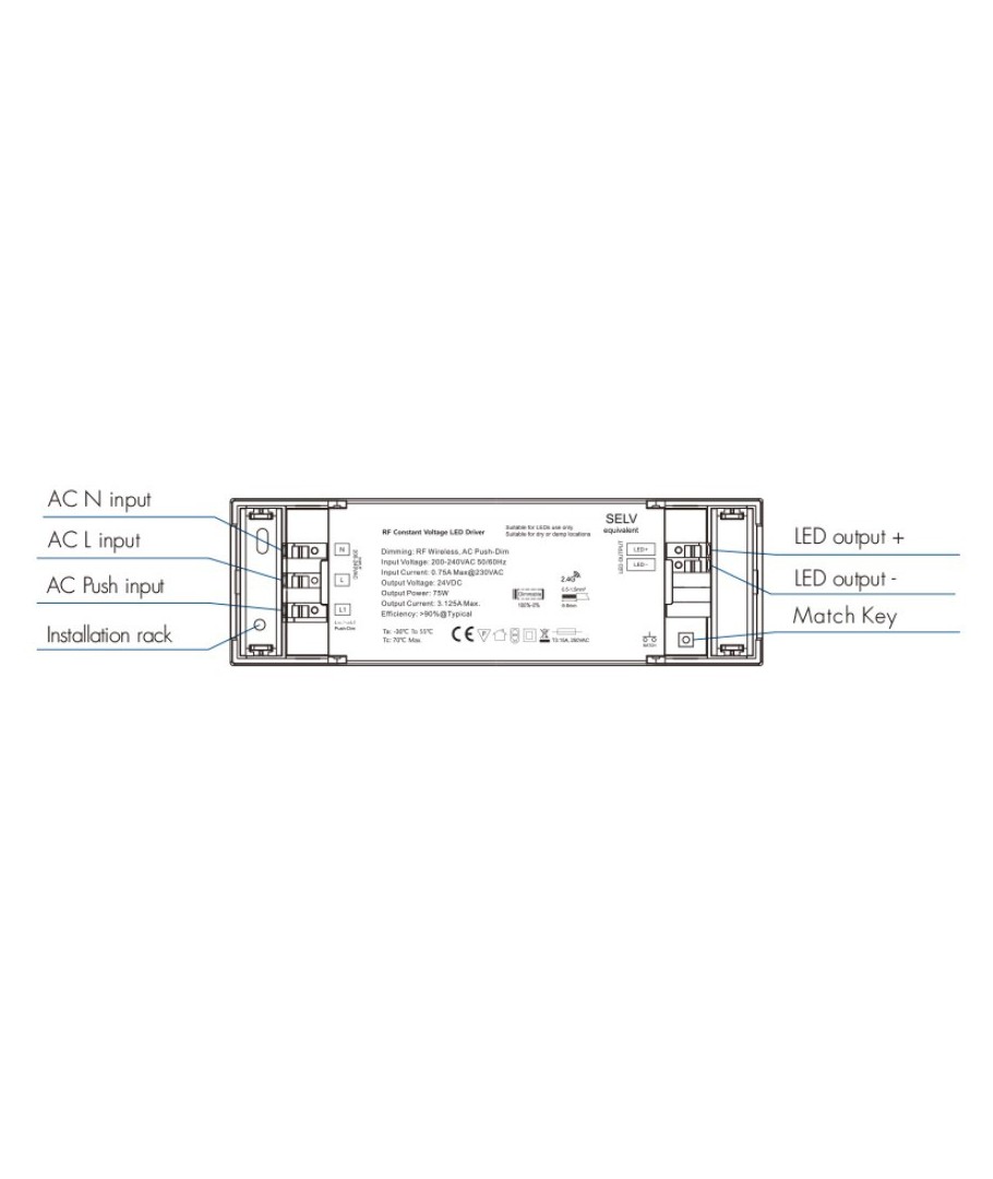 Den integrerte dimmefunksjonen via RF og push-dim gir deg fleksibiliteten til å justere lysstyrken etter dine behov, skape ønsket atmosfære og spare energi når full lysstyrke ikke er nødvendig. For enkel bruk og installasjon, sørger kontaktpunktene for en pålitelig forbindelse til ditt eksisterende strømnett.