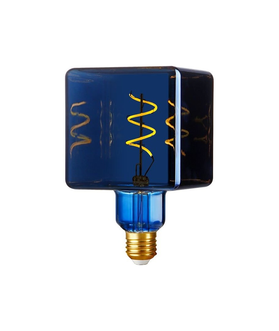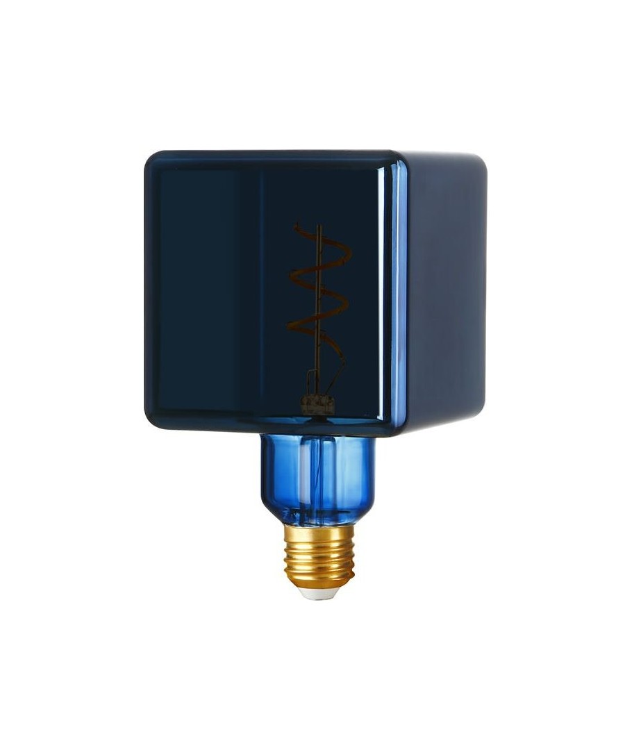 E27 4W dimbar LED-pære i unik 'Ice Cube'-form, perfekt til dekorative formål med en flott metallic blå finish.