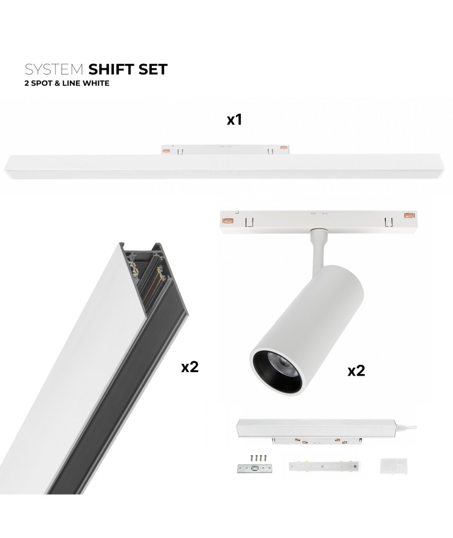 I dette SHIFT-settet får du 2x 1 meter skinner, 2 LED-spotter og en lysskinne, samt alt du trenger for å installere settet.