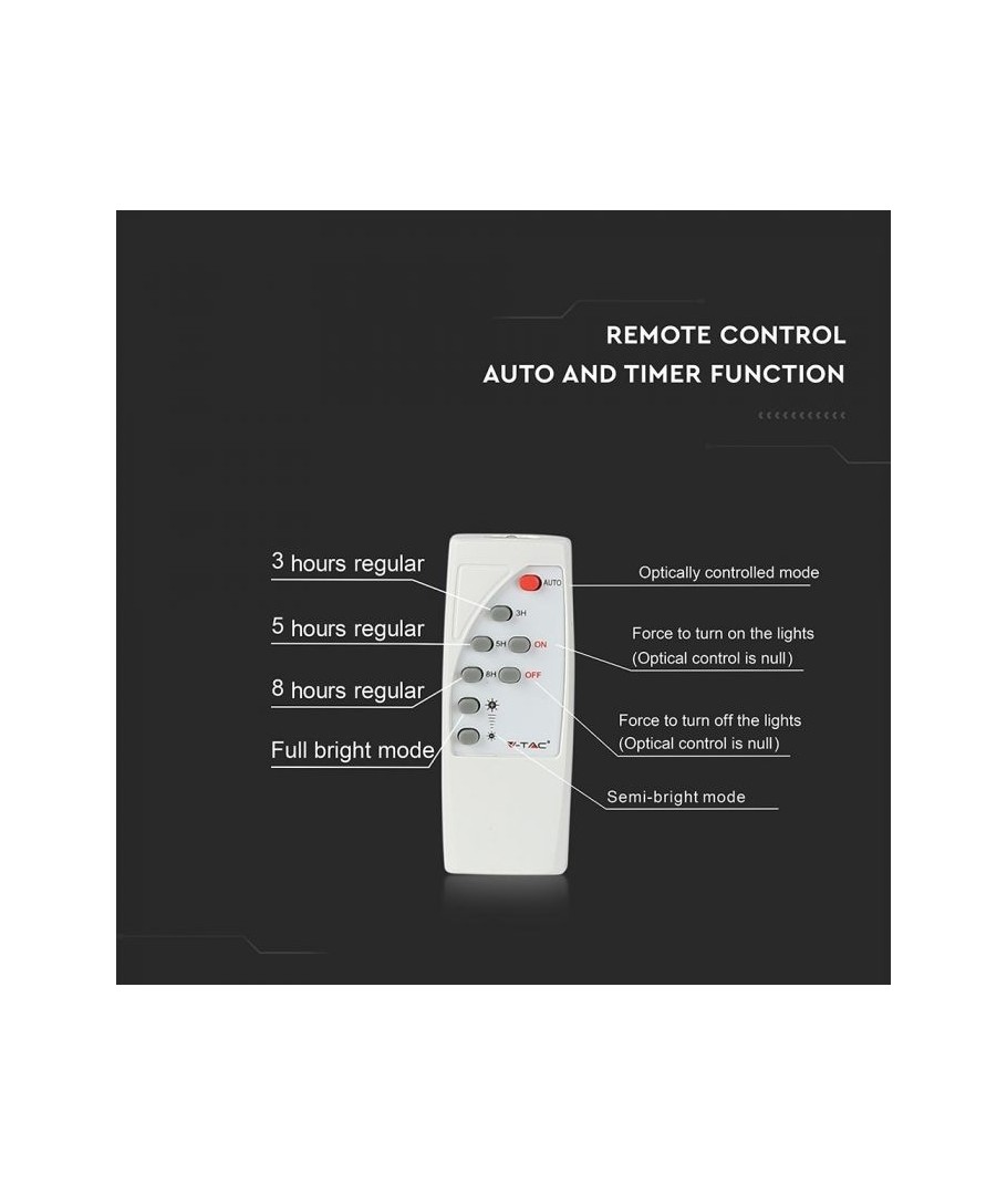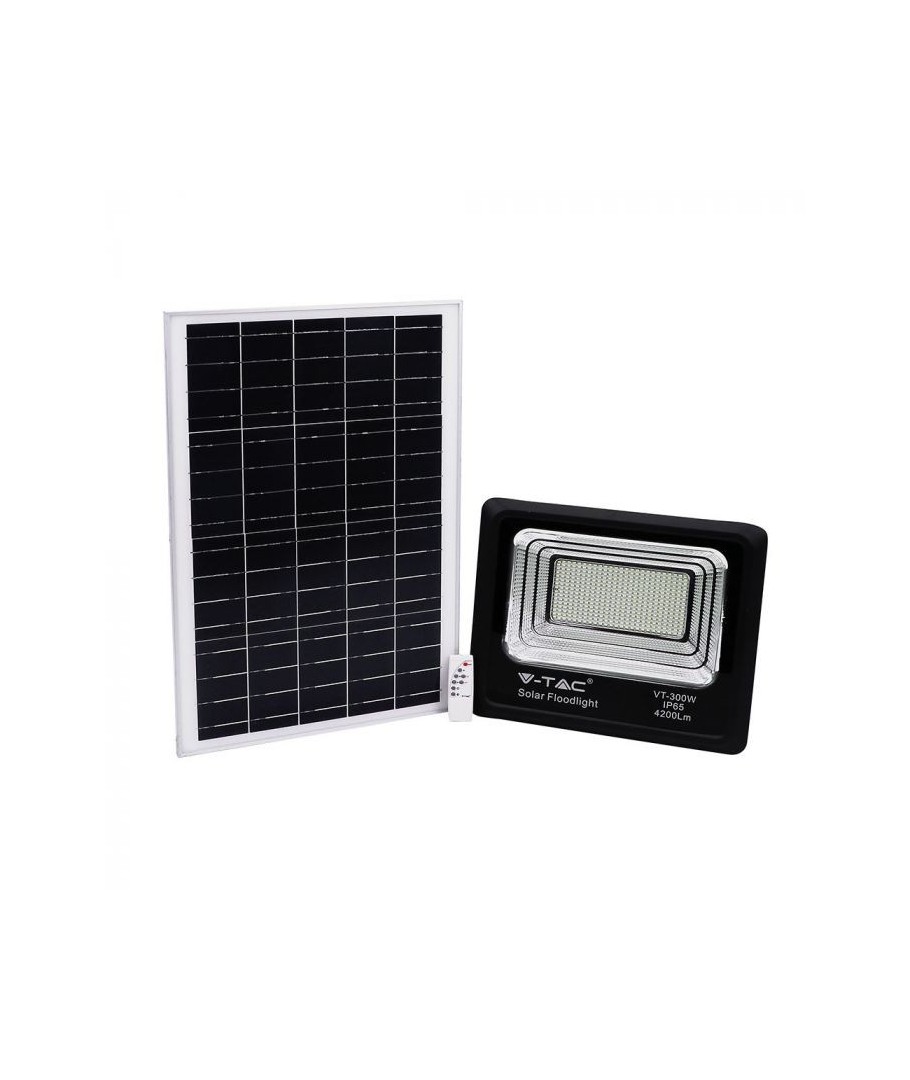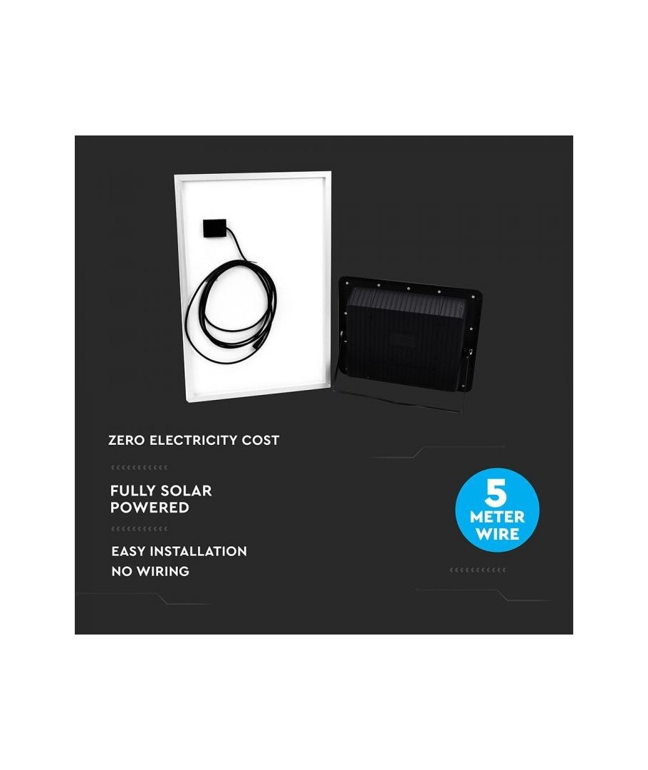 V-Tac 50W LED Solar flomlys - Sort, en praktisk og energieffektiv løsning for utendørs belysning. Denne lyskasteren inkluderer en solcelle og fjernkontroll og er designet for å tåle alle værforhold med sin IP65-klassifisering. Den har også en hendig timerfunksjon som lar deg stille den til å slå seg av automatisk etter en viss tidsperiode. Med en full ladetid på kun 4 timer kan denne projektoren gi 8 timer lys. Den kommer også med en 5 meter lang ledning, som gir deg fleksibiliteten til å plassere den der du trenger den.