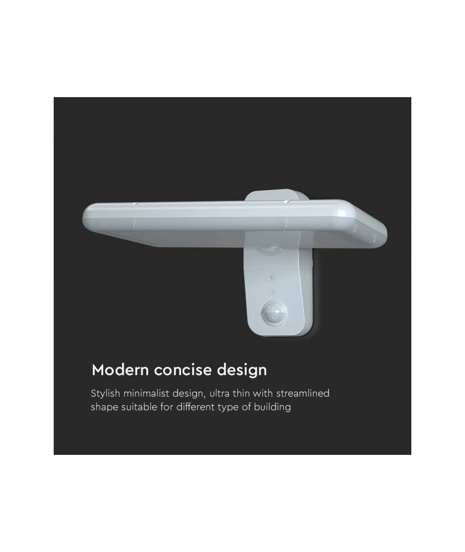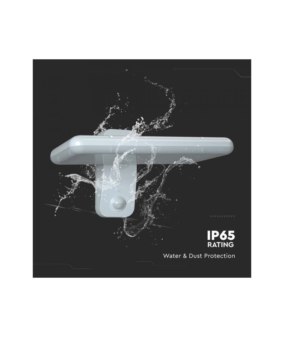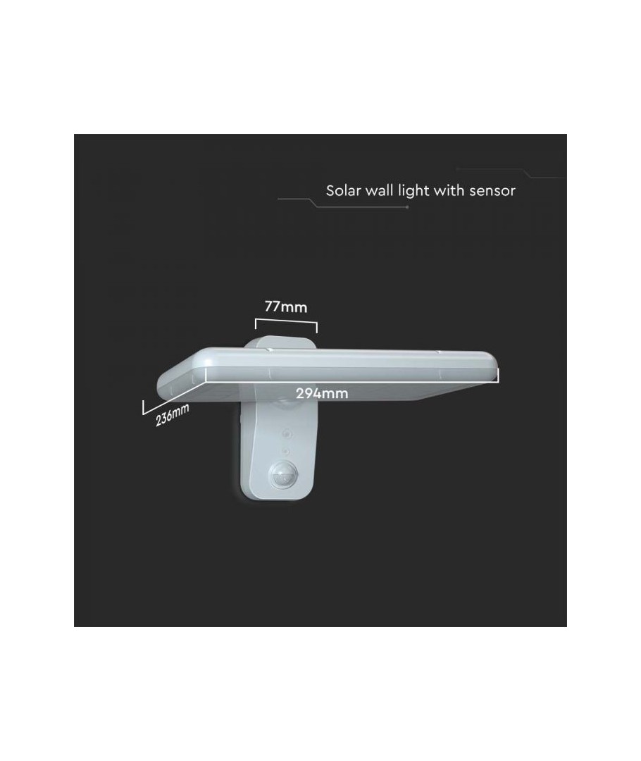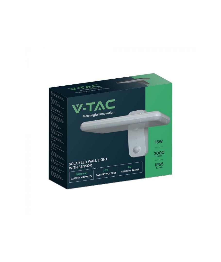 Oppgrader uteområdet ditt med V-Tac 15W LED Solar vegglampe. Denne sorte vegglampen er utstyrt med sensor og har høy beskyttelsesgrad IP65, som gjør den egnet for utendørs bruk.