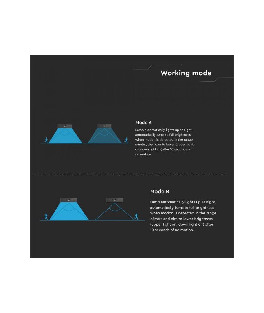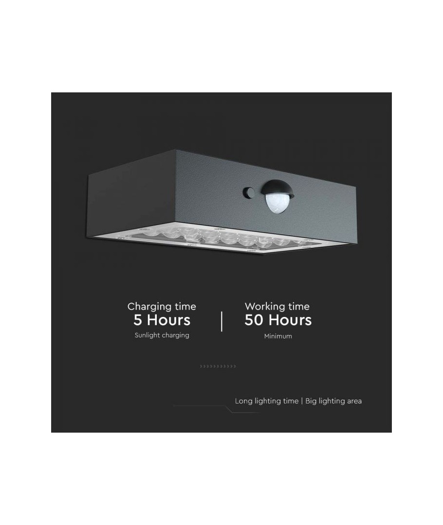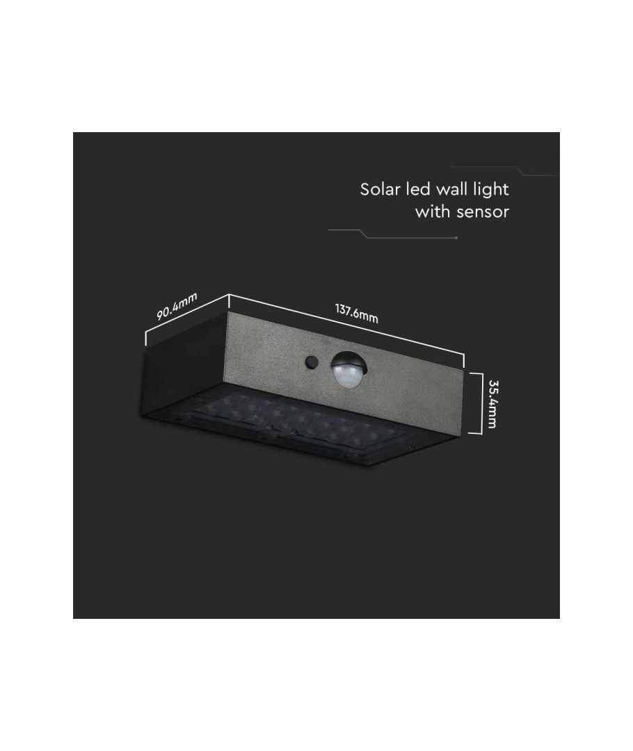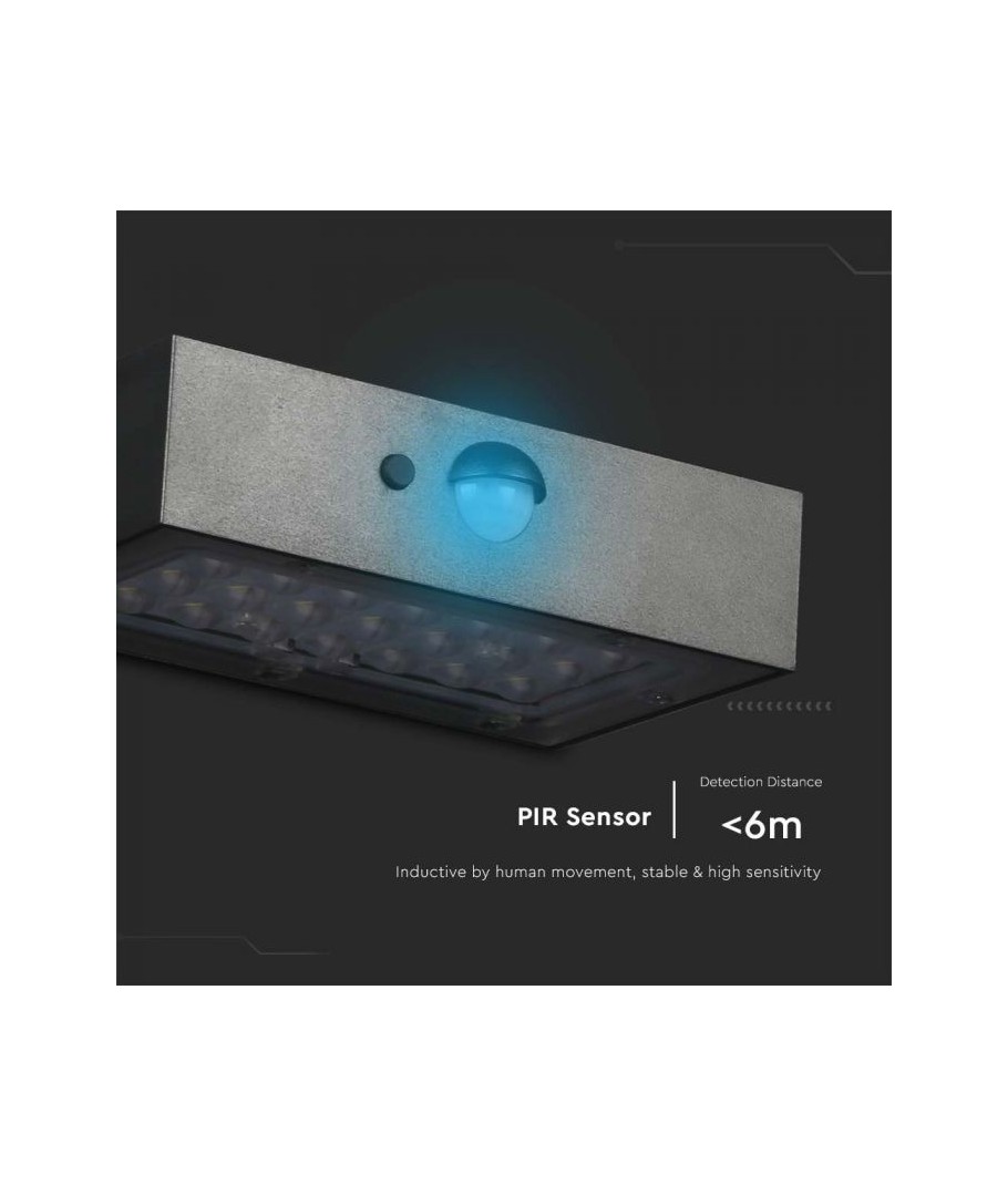 V-Tac 3W LED Solar vegglampe er den perfekte løsningen for utendørs belysning. Den har en fin sort finish og er utstyrt med en sensor med radius på 6 meter, som sørger for at lampen tennes automatisk når det er bevegelse i nærheten. Lampen har også to forskjellige lysvarianter. Med sin IP65-klassifisering er den vanntett og egnet for utendørs bruk i all slags vær. Det beste er at det er solcelledrevet, så det er energieffektivt og miljøvennlig. Etter bare 5 timers lading kan lampen lyse i minimum 50 timer. Gjør utendørsbelysningen din smartere og mer energieffektiv med V-Tac 3W LED Solar vegglampe.
