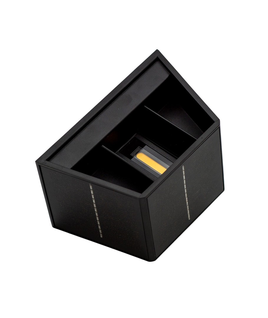 Vår solcelledrevne vegglampe tilbyr en stilfull og funksjonell løsning for utendørs belysning. Den er designet i en elegant svart finish som gir et tidløst og moderne preg til enhver fasade eller terrasse.