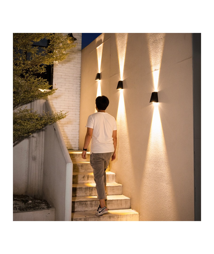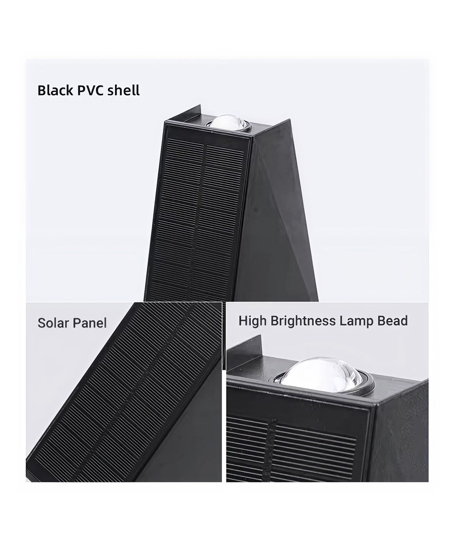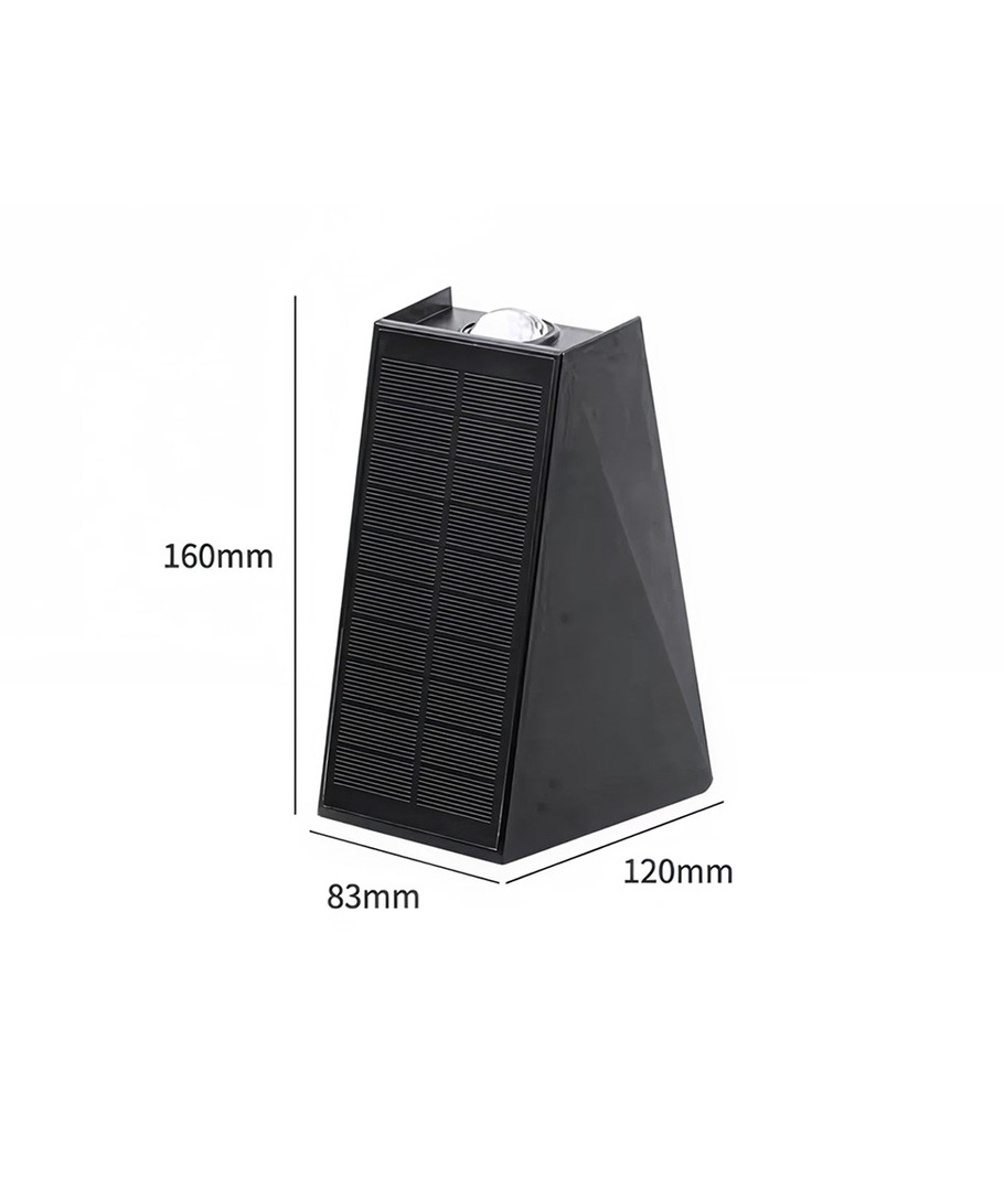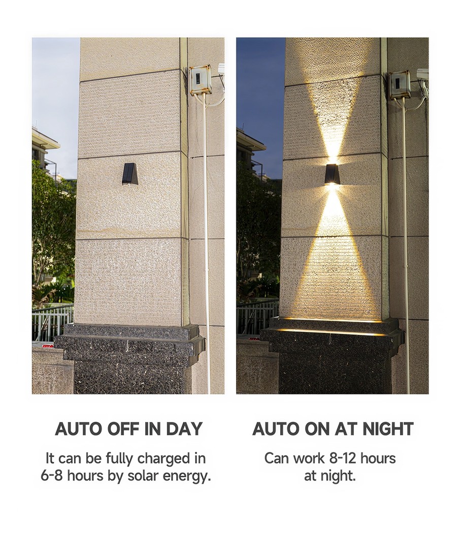 Opplev enkelhet og effektivitet med vår solcelle vegglampe, designet for å gi både opp- og nedadgående lys som skaper en raffinert belysningseffekt. Denne lampen er en ideell løsning for å lyse opp uteområder med stil og funksjonalitet.