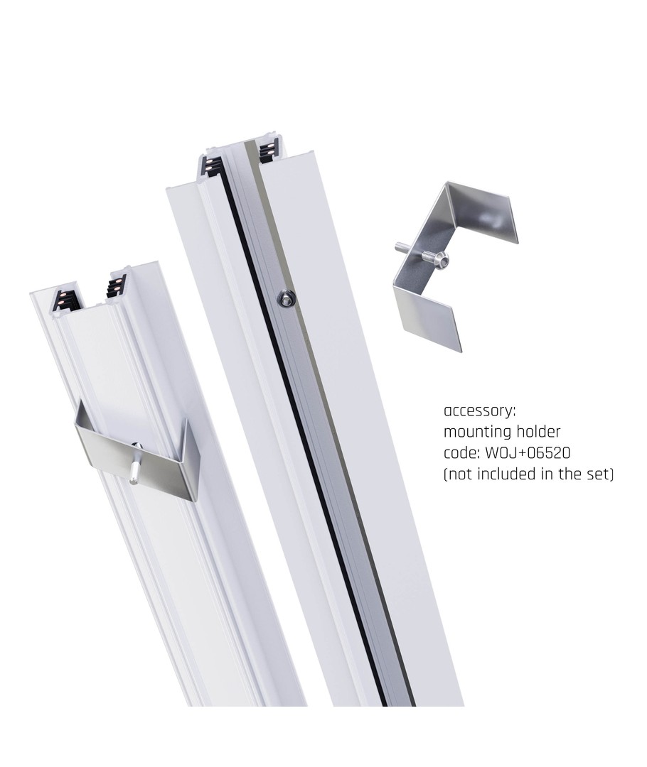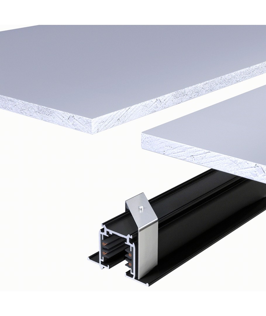 Dette skinnesystemet er designet for enkel innbygging og krever tilkobling til en 230V forsyning. Med dimensjoner på 1000 x 36 x 55 mm, tilbyr det en diskret og effektiv løsning for belysning. Hul størrelsen for installasjon må være 40x1006 mm for en nøyaktig passform.
