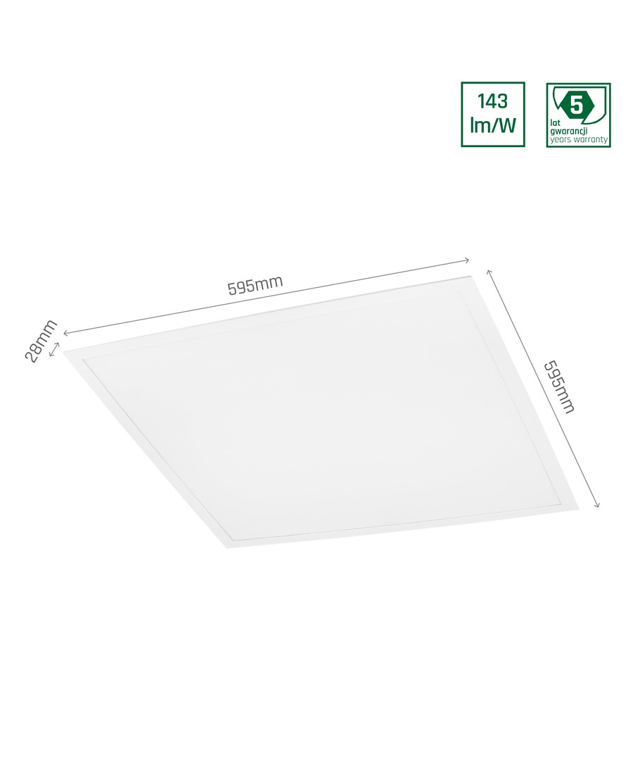 Panelet måler 595 x 28 x 595 mm og har en enkel installasjon som krever en tilkobling til 230V. Med en fargetemperatur på 6000K i kald hvit, gir det et klart lys som i stor grad brukes til spesialapplikasjoner som lakkeringshaller, akvarier og dekor.