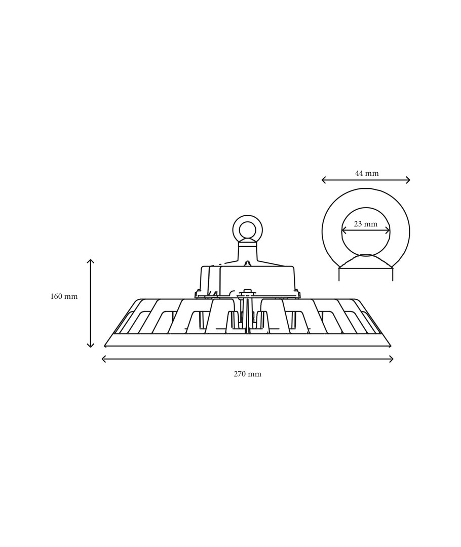 Med dimensjoner på 270 x 160 mm og en integrert lyskilde, kombinerer lampen en profesjonell driver og god kjøling for å sikre lang levetid med minimal lysreduksjon. Dette gjør det til et ideelt valg for områder der konstant og pålitelig belysning er nødvendig.