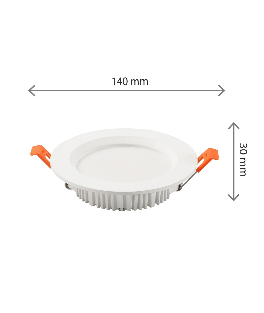 Downlight-panelet har en dimensjon på 140 x 30 mm og passer i et hull på Ø11cm. Med en IP44-klassifisering tåler det fuktig luft og vannsprut på fronten, noe som gjør det egnet for bruk i områder som kan bli utsatt for fuktighet.