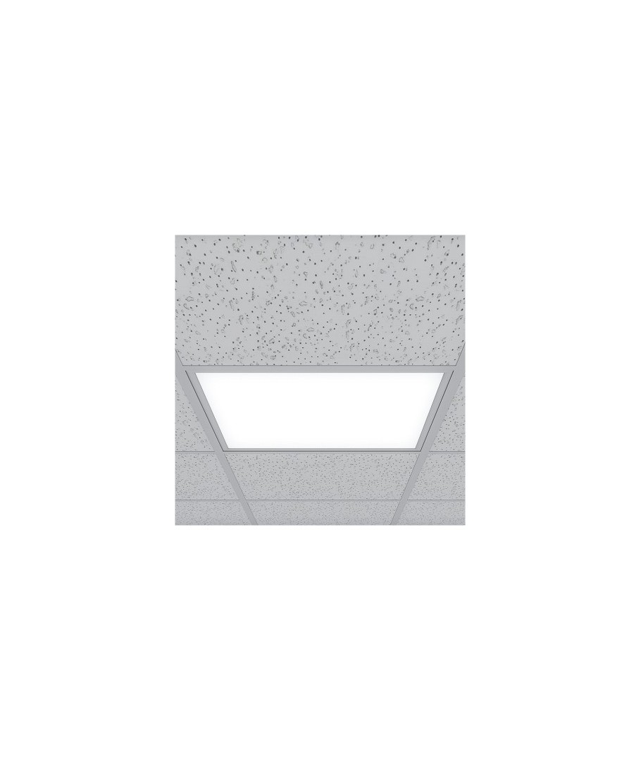 Panelet må kobles til en 230V strømforsyning, og takket være de slanke dimensjonene på 595 x 13 x 595 mm, passer det sømløst inn i vanlige takraster. Dette gir både estetikk og funksjonalitet i ett kompakt design.