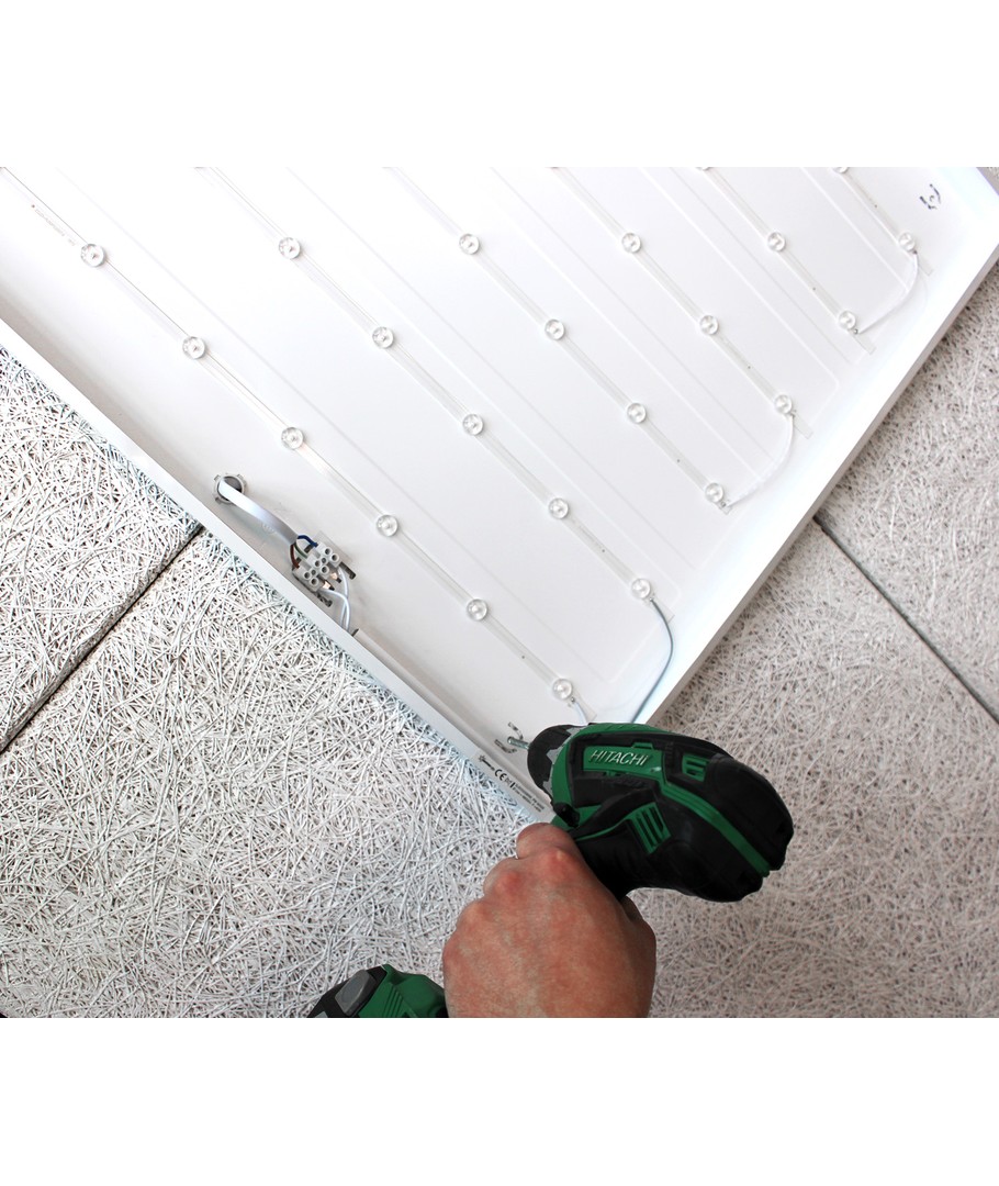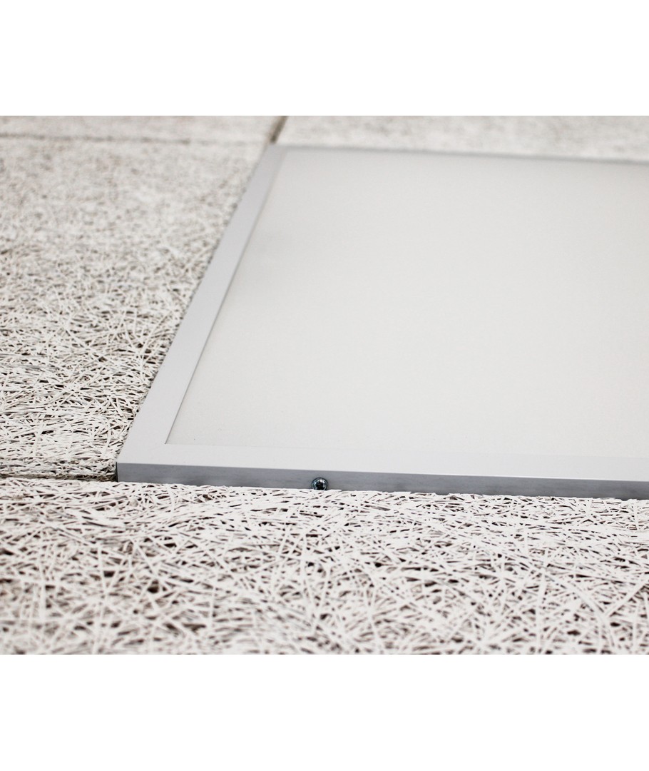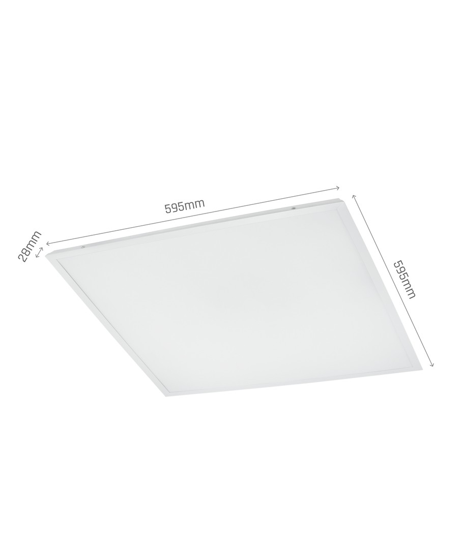 Det elegante designet med hvit ramme gir et moderne og stilrent utseende som enkelt kan integreres i ulike interiørstiler. Med dimensjoner på 595 x 28 x 595 mm, passer panelet perfekt i standard himlingssystemer og gir en sømløs utseende.