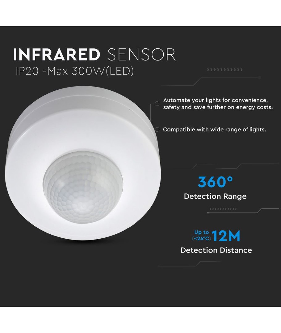 Oppdag en effektiv løsning for intelligent lysstyring med vår Tak-sensor med manuell overstyring, designet for innendørs bruk med en maksimal belastning på 300W.