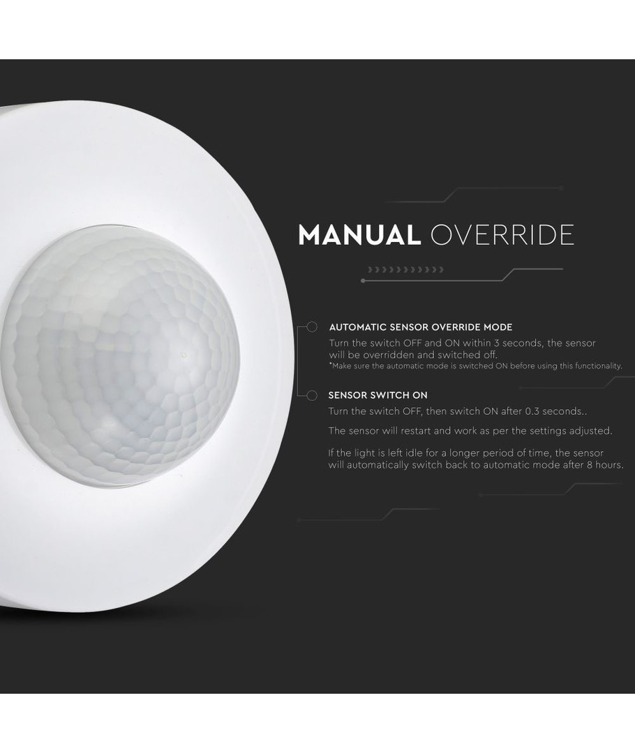 Hvis lyset forblir på i en lengre periode uten bevegelse, vil sensoren automatisk bytte tilbake til automatisk modus etter 8 timer.