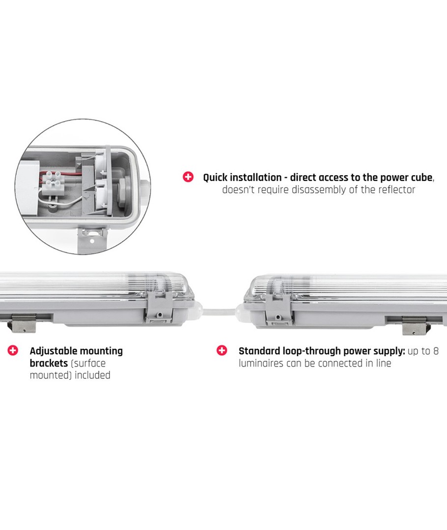Dette armaturet krever tilkobling til en 230V forsyning, og er utstyrt med en praktisk gjennomgangskobling som gjør installasjonen enkel og rask. Selv uten LED-røret inkludert, er dette armaturet klargjort for en ukomplisert oppsettsprosess.