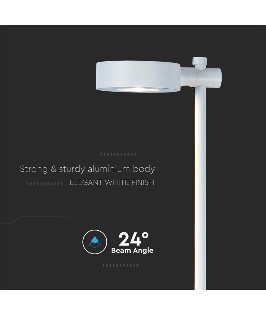 Denne elegante pullertlampen gir en vakker belysning i utendørsområder. Med en effekt på 6W og en lysstyrke på 620 lumen, sørger den for tilstrekkelig og fokuserte lysstråler med en spredningsvinkel på 24 grader. Dette sikrer et kontrollert lys, ideelt for både arbeids- og hverdagsbruk.