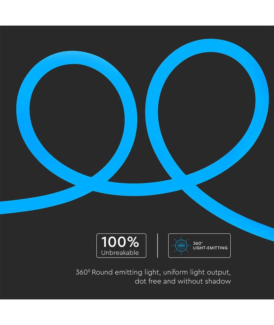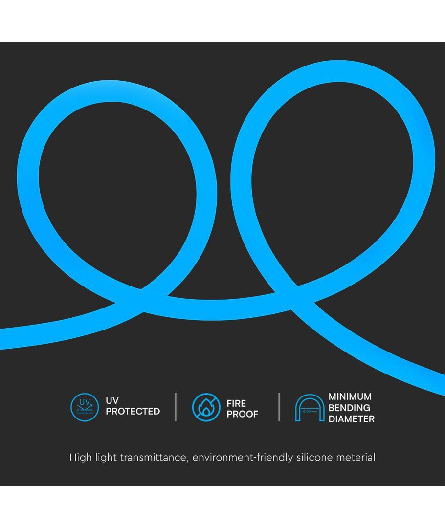 Oppgrader rommet ditt med et iøynefallende lys som gir en kreativ og moderne følelse. Denne 12W/m Neon Flex 24V leveres med en slående blå farge og er perfekt for innendørs dekorasjon og belysning.
