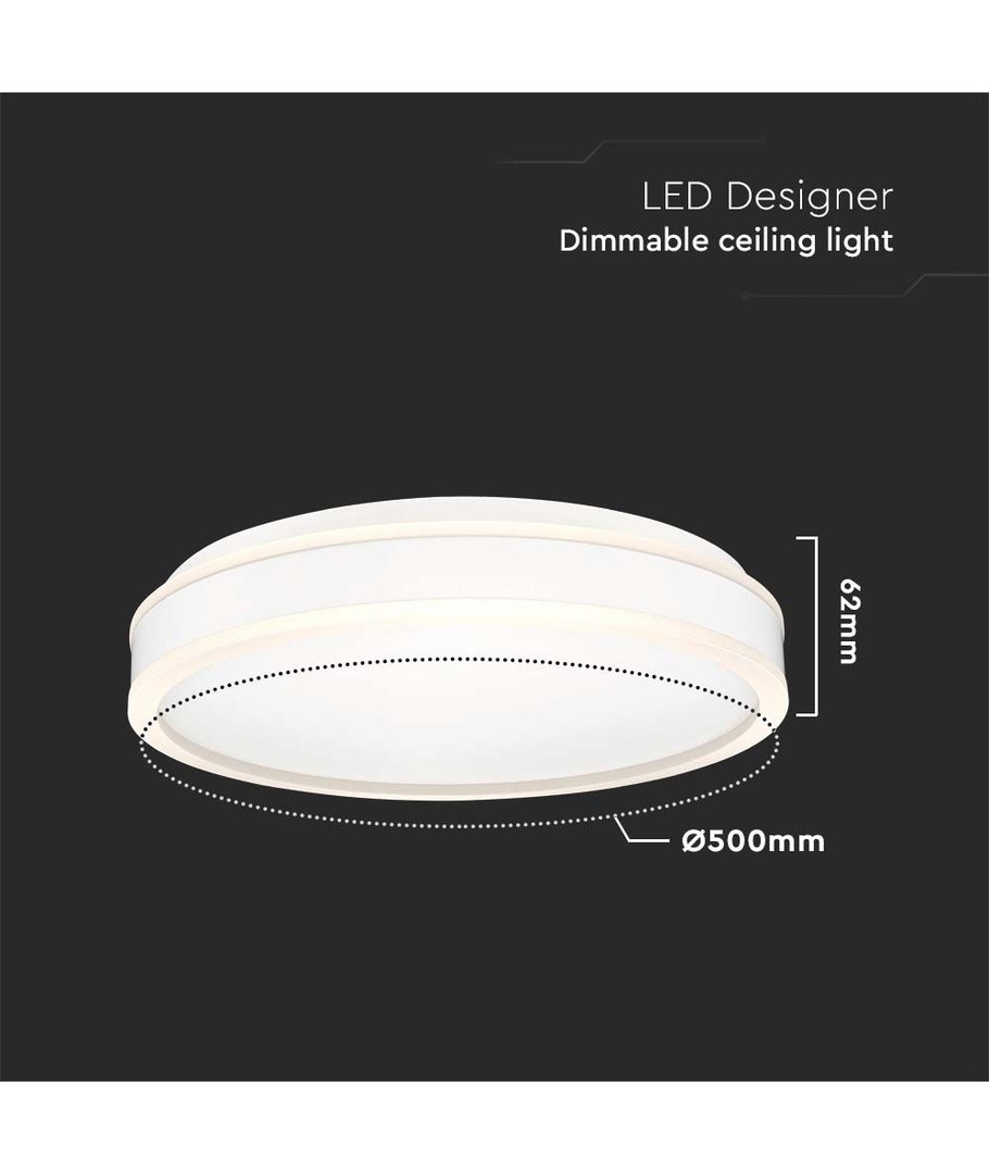 Med en diameter på 500 mm og høyde på 62 mm, passer denne runde lampen godt i de fleste rom. Den har et rent og moderne design med integrert lyskilde som er lett å installere.