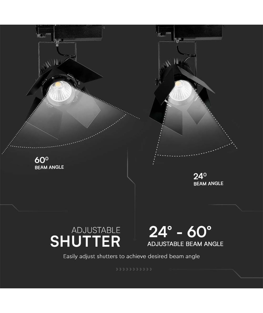 Med en lysytelse på 3000 lumen og en RA-verdi på 90-95, leverer denne skinnespoten et lys som viser farger på en levende og naturlig måte. Perfekt til omgivelsene du ønsker å fremheve, sikrer den fokuserte lysvinkelen på 24/60 grader kontrollert og tilpasset belysning.