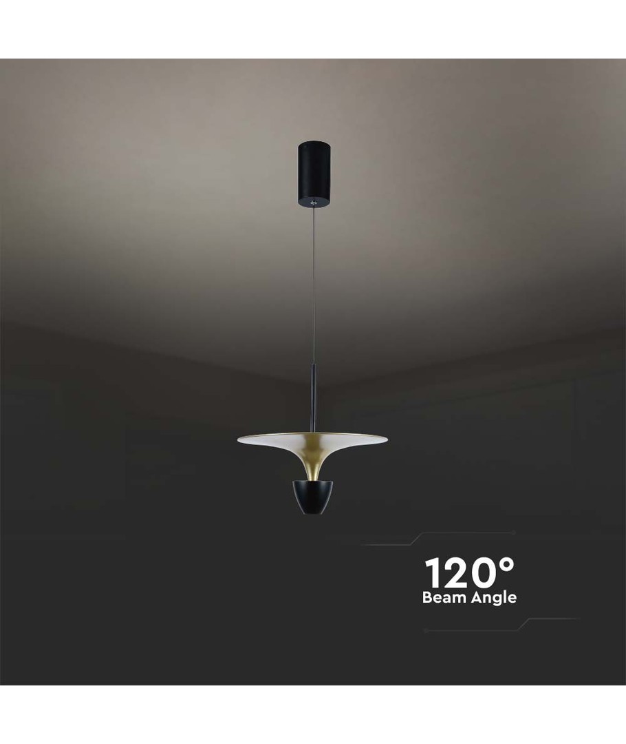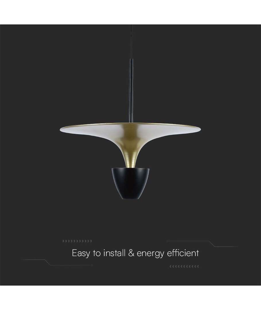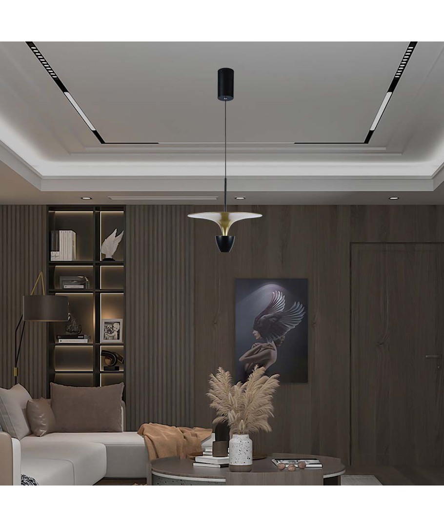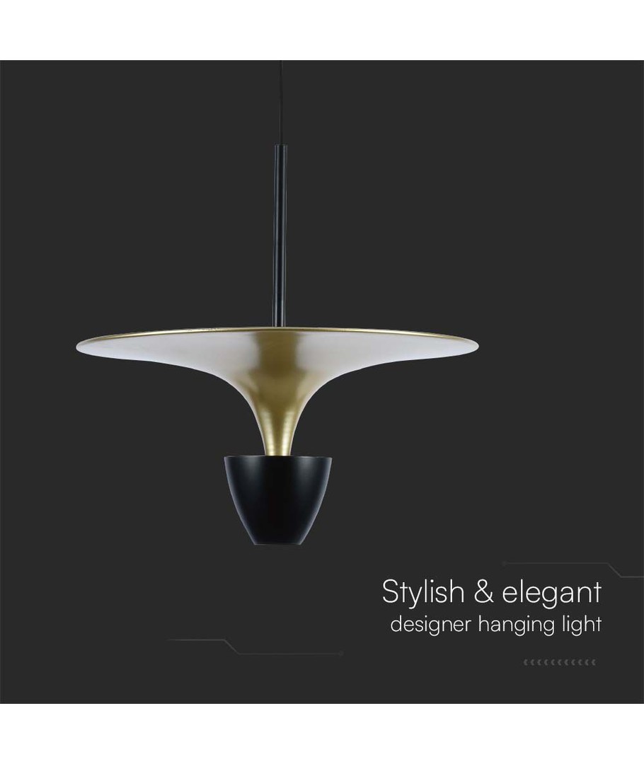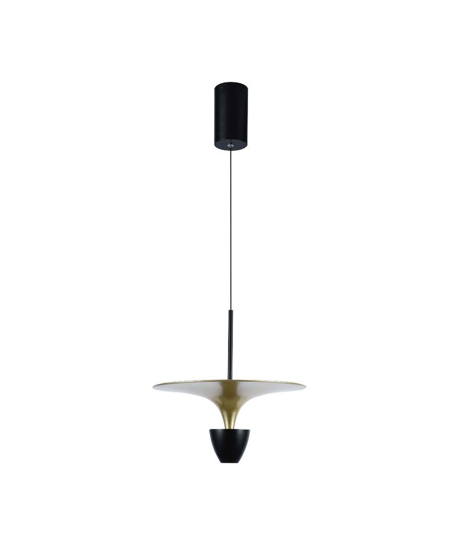 Denne stilrene hengelampen kombinerer moderne design med høy funksjonalitet for å gi et ideelt lysmiljø i hjemmet eller på kontoret. Med sin diskrete sort og gull-finish fungerer lampen som både lyskilde og stilig interiørdetalj.