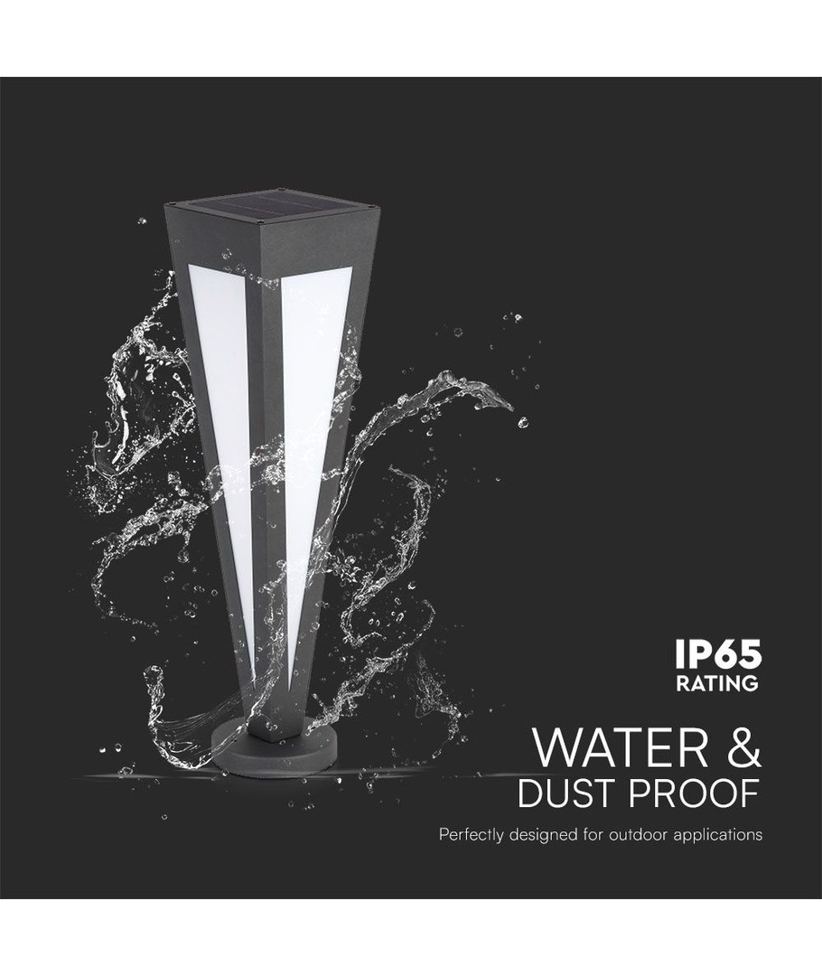Denne solcellelampen er designet for utendørs bruk med en robust konstruksjon og IP65-klassifisering som gjør at den kan håndtere både vannsprut og regnskyll uten problemer. Dette sikrer pålitelig ytelse året rundt, uansett værforhold.