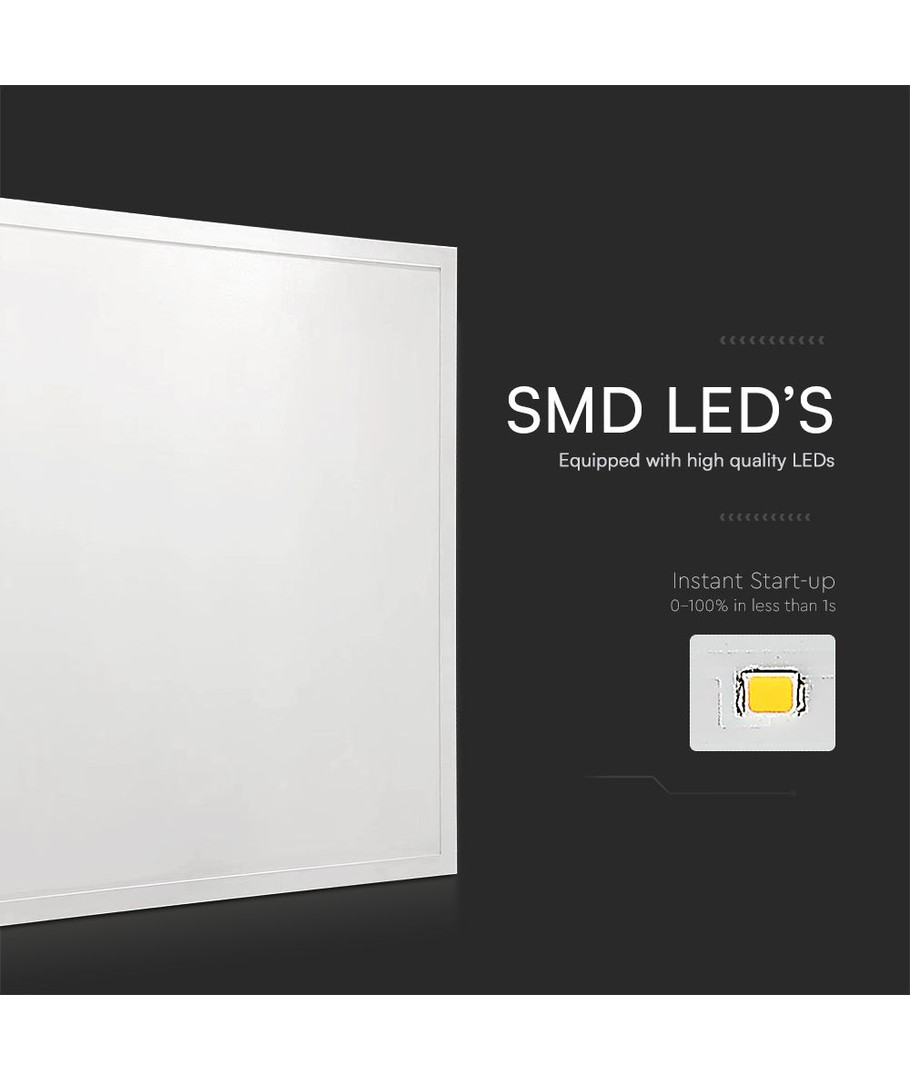 Som en del av V-Tac Pro-serien, følger produktet med en 5 års produsentgaranti, noe som gir ekstra trygghet. Panelet benytter LED av høyeste kvalitet for å sikre en levetid på opptil 30.000 timer med minimal reduksjon i lysstyrke. En profesjonell og pålitelig driver kombinert med effektiv kjøling bidrar til panelets lange levetid.