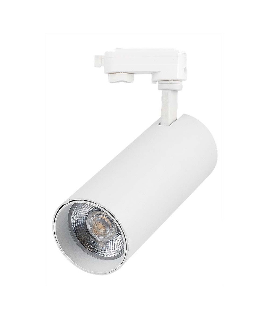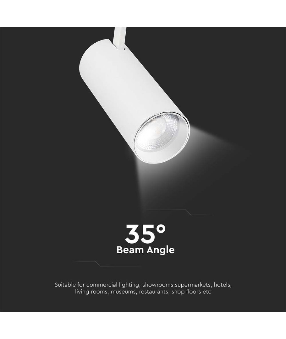 Skinne-spotens design gir et fokusert lys med en spredningsvinkel på 35 grader, som sikrer et kontrollert og målrettet lys. Den kommer med et hvitt hus, reflektor og bakdeksel som elegant smelter inn i moderne interiør.