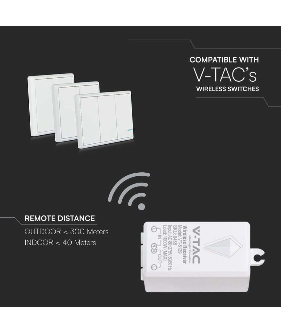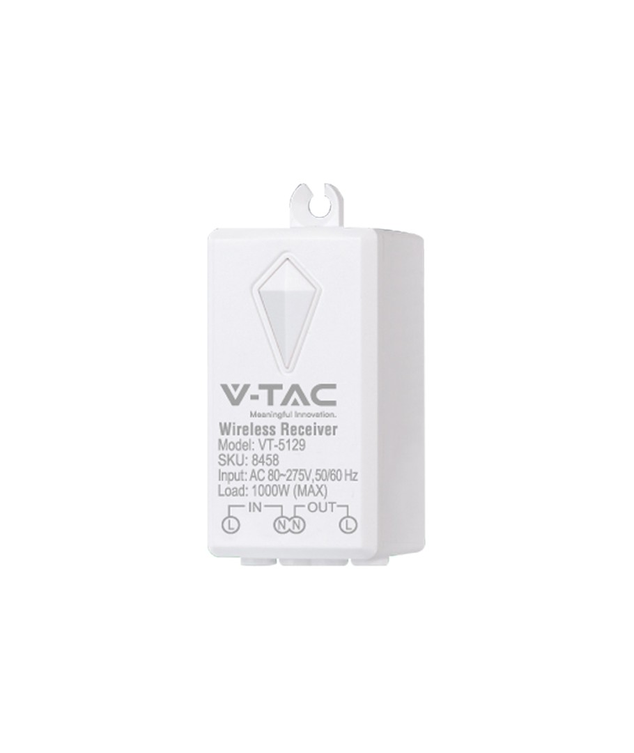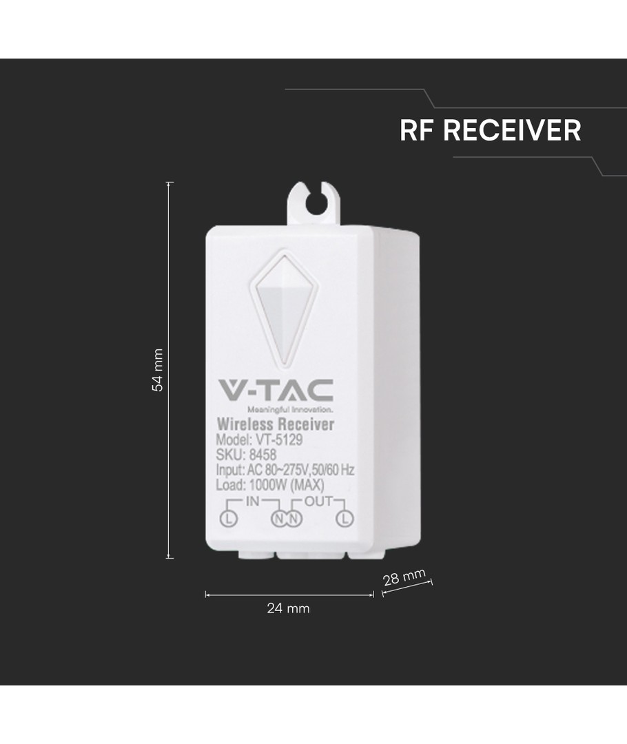 Vt-5129 RF-mottakeren sikrer enkel kontroll med trådløse brytere.- Dimensjoner: Kompakt format med målene 24mm x 54mm x 28mm.