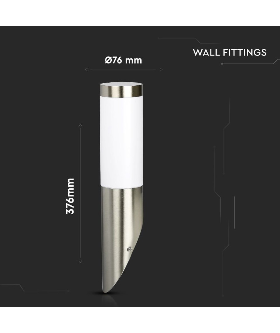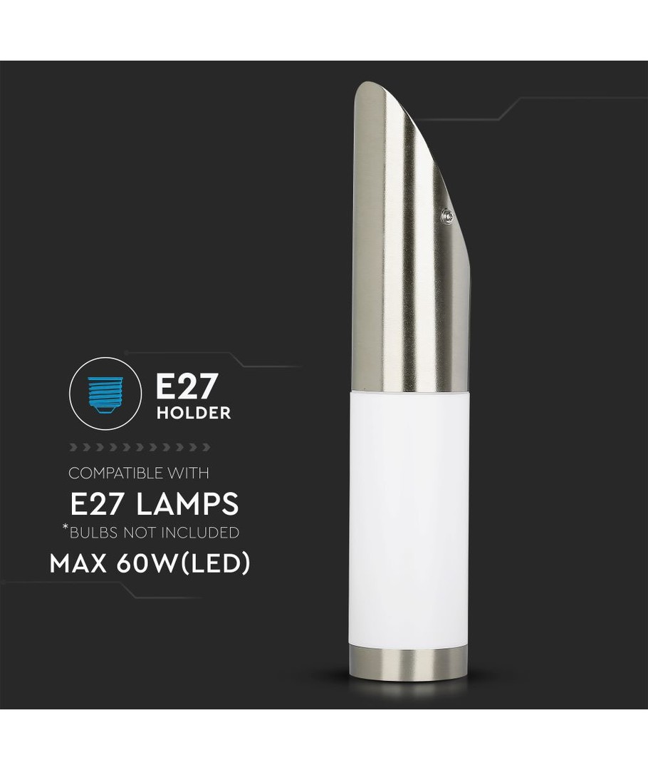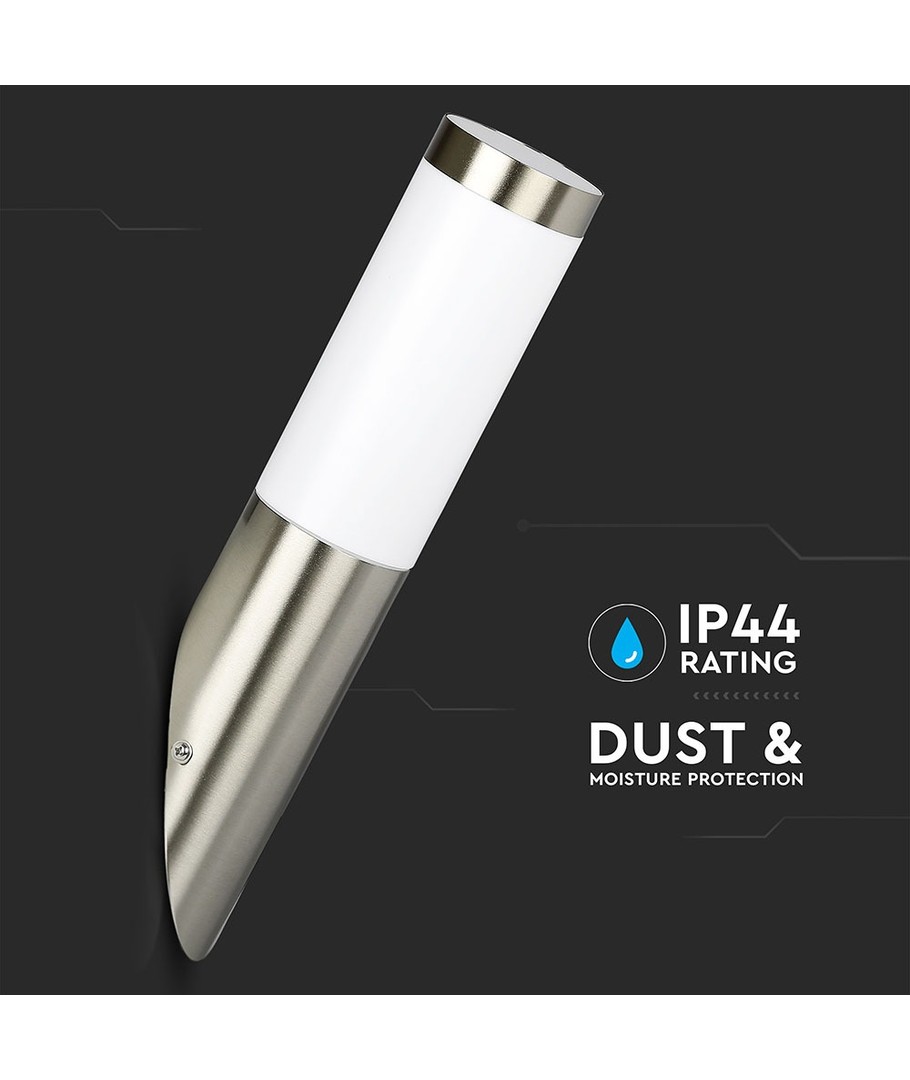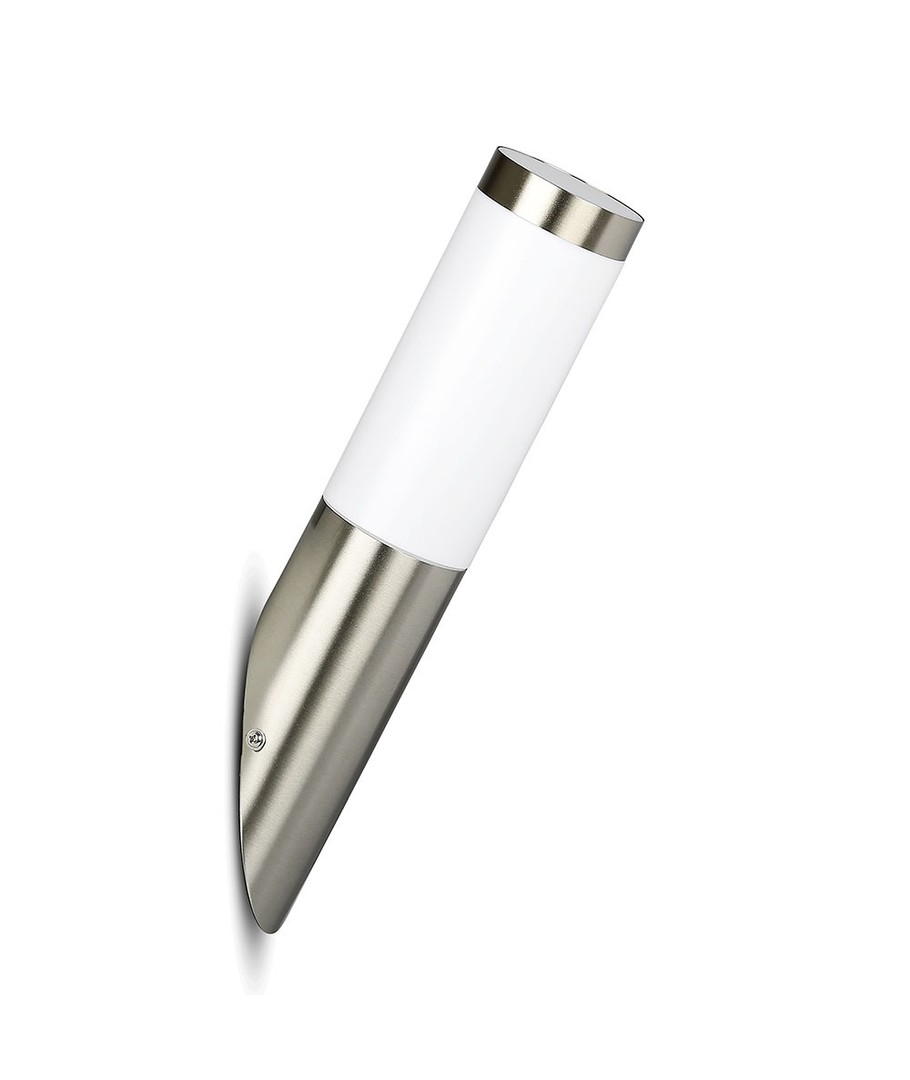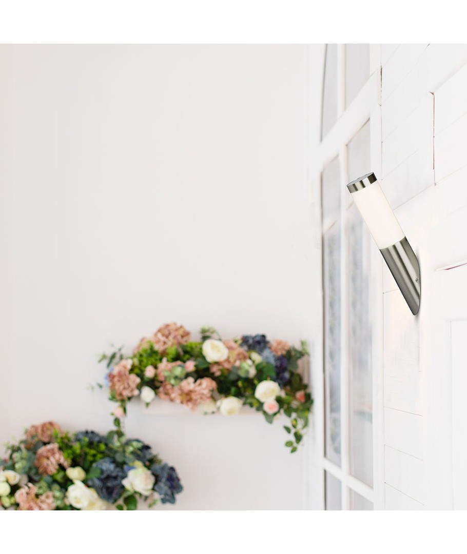 Hus i Rustfritt StålLampens hus er laget av rustfritt stål med en diagonal vinkel, noe som gir et moderne og sofistikert utseende. Det rustfrie materialet sikrer varighet og beskytter mot vær og vind.