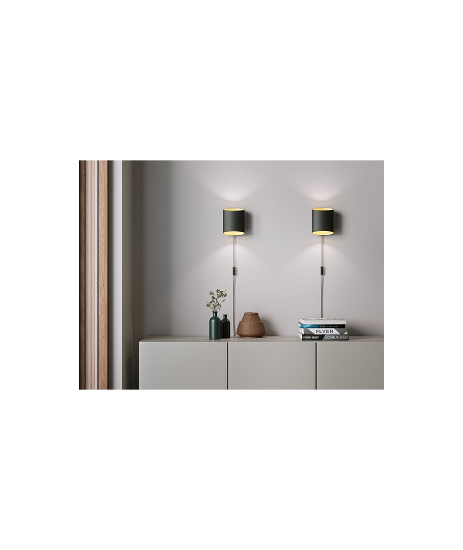Flott, sort vegglampe med en indre bekledning i messing, samt en fatning til G9 pære, som vil lyse både opp og ned.