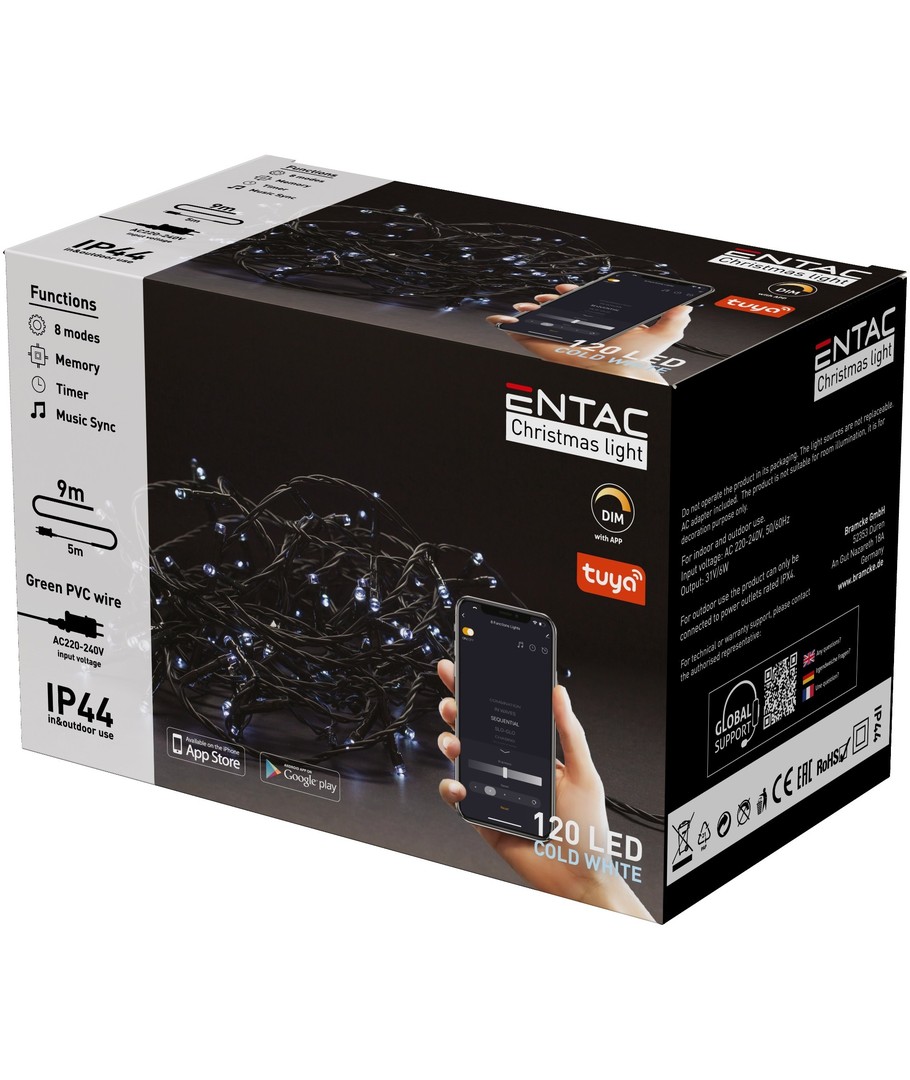 9 meters Smart Home utendørs LED julelysslynge med 120 LED's i kald hvit.
